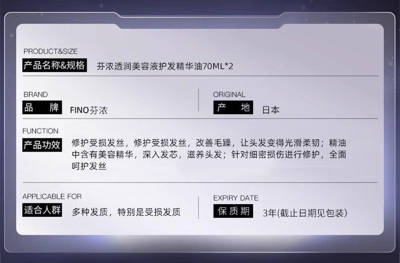 【Ding Yuxi Same Style】Fennong FINO Translucent Beauty Serum Hair Care Essence Oil Repair Moisturizing Hair Strands70ml*2